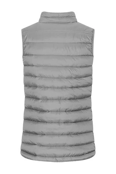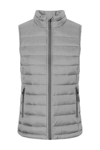 Polstrovaná vesta. Specifika: nepromokavé zipy, stojáček, ochrana brady, uvnitř kapsa, zip po celé délce, dvě boční kapsy na zip, tunýlková stahovací šňůrka na lemu se stopkami uvnitř, neviditelný zip na ozdobu, štítek neutrální velikosti. Vesta je vyrobená z nylonu (vnější/vnitřní materiál) a polyesteru (vatování). Vesta má moderní střih.
