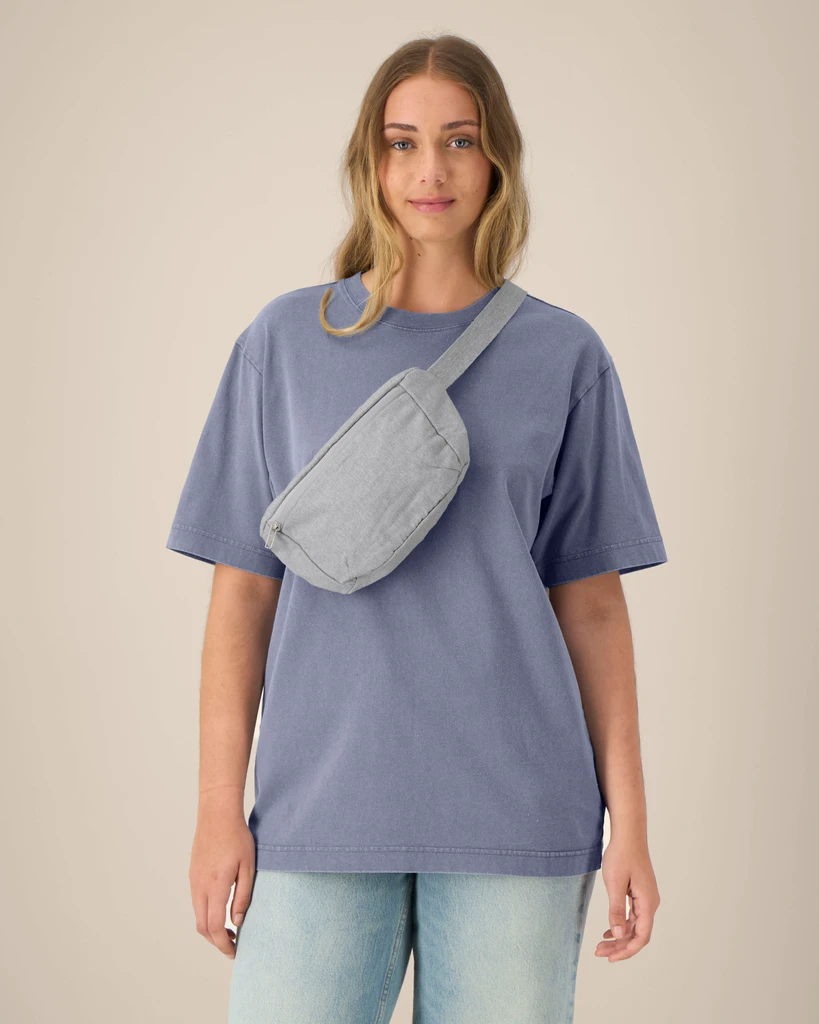 Materiál: Plátno, 80% Recyklovaná bavlna, 20% recyklovaný polyester; Nastavitelný grogrénový pásek pro nošení přes rameno nebo kolem pasu, plastová boční spona, plastový nastavovač, elastická zarážka, tvarovací zarážka vpředu, nylonová přední kapsa na obrácený zip; Certifikáty: Global Recycled Standard (GRS), Fair wear, STANDARD 100 by OEKO-TEX®, Peta - Approved VEGAN
