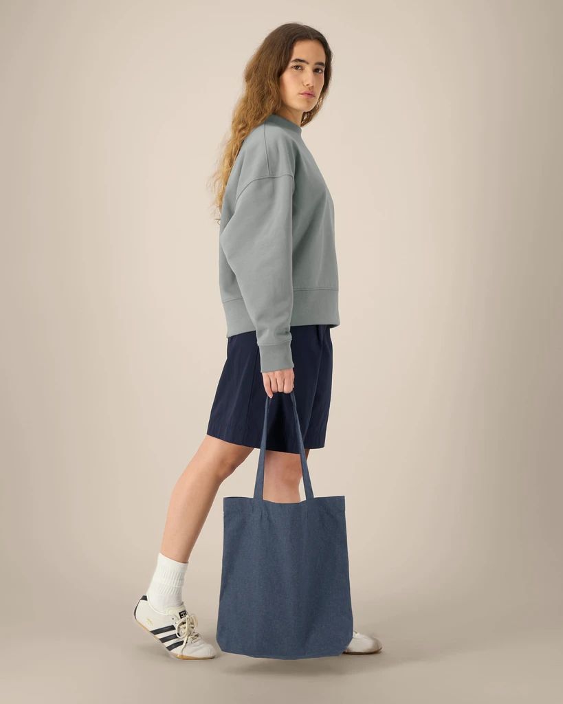 Gramáž: 300 g/m²; Materiál: 80% recyklovaná česaná bavlna, 20% polyester; Dvojitý horní okraj pro pevnost a čistý povrch, Dlouhé rukojeti se zesíleným křížovým stehem, tvarovací šev dole pro vytvoření objemu