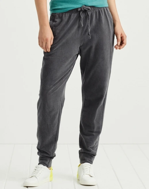 Předeprané, jednotlivě barvené (garment dye), vícenásobně prošitý pas s barevně ladící šňůrkou, postranní kapsy, žebrované manžety.