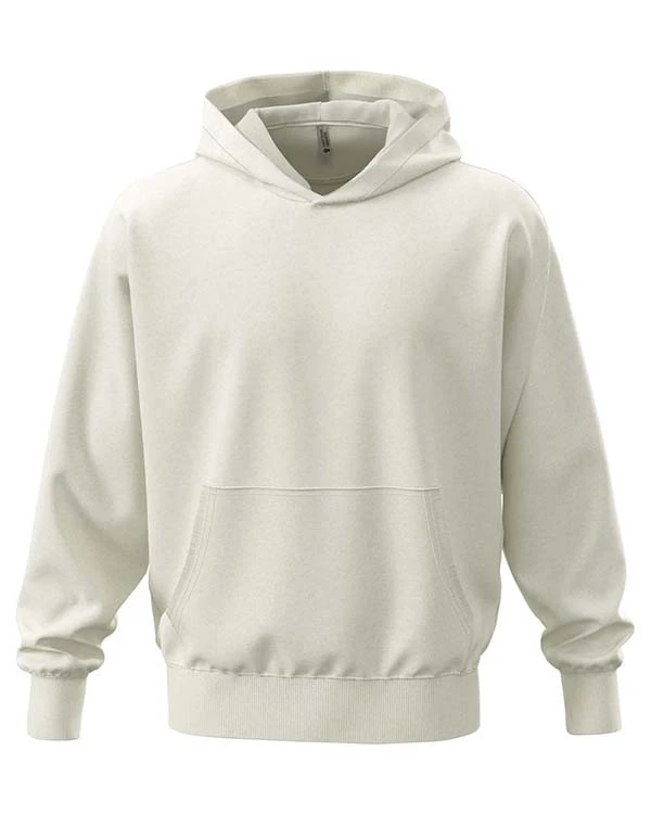 N9307-B009Oversized unisex mikina s kapucí vyrobená z těžké směsi česané bavlny a recyklovaného polyesteru, doplněná dvojitou kapucí, potisknutelným půlměsícem, širokými žebrovanými manžetami, límcem a pasem.