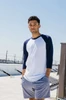 Kolem výstřihu lemování v kontrastní barvě, kontrastní raglánové rukávy, dvojité švy, spodní lem šitý overlockem, saténová cedulka.