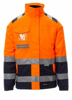 Dámská dvoubarevná, dobře viditelná bunda s pruhy 3M, plastovým zipem s kovovým stahováním s klopou a suchým zipem, se sklopnou kapucí, elastickými nastavitelnými manžetami, dvěma skrytými předními kapsami, jednou náprsní kapsou s držákem odznaku, polstrovaný, fleecový vnitřní límec, vnitřní kapsa, švy s tepelnou páskou