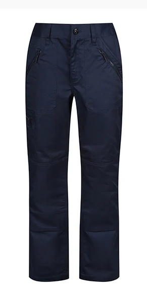 Částečně elastický pas s poutky na pásek, zapínání na kovový knoflík a zip, zesílený šev v rozkroku, 2 přední kapsy na zip, 1 s malou kapsičkou na mince, 2 zadní kapsy, 1 boční kapsa na zip, zesílené švy s trojitým prošíváním