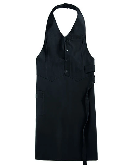 Vesta s jemnými proužky a se 4 ozdobnými knoflíky, vázanka nastavitelná pomocí 3 knoflíčků, našitá boční kapsa (17 x 19 cm) se 2 přihrádkami, 2 poutka, unisex střih, odolný nemačkavý materiál, jednoduchá údržba, všechny barvy lze prát na 95°C.