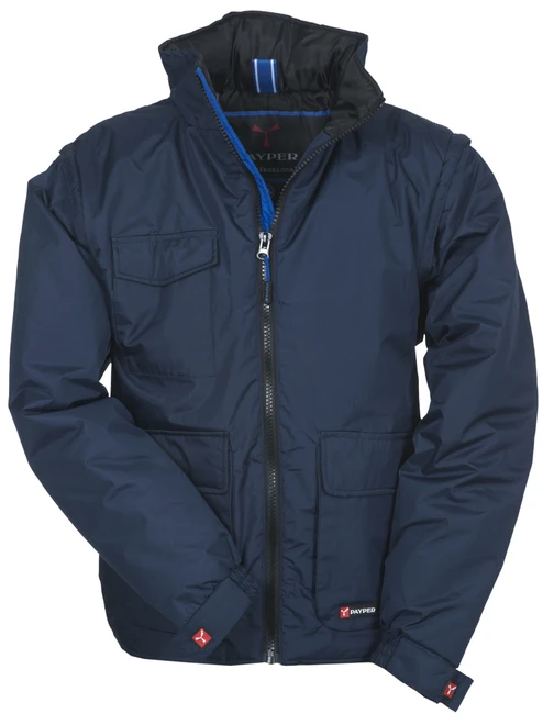 Odnímatelné rukávy, 8 mm široký plastový zip po celé délce, kovový jezdec, kapuce schovaná v límci, elastické manžety, 2 přední prostorné kapsy se speciálním zavíracím systémem, 2 boční kapsy, kapsa na hrudi, vycpávka